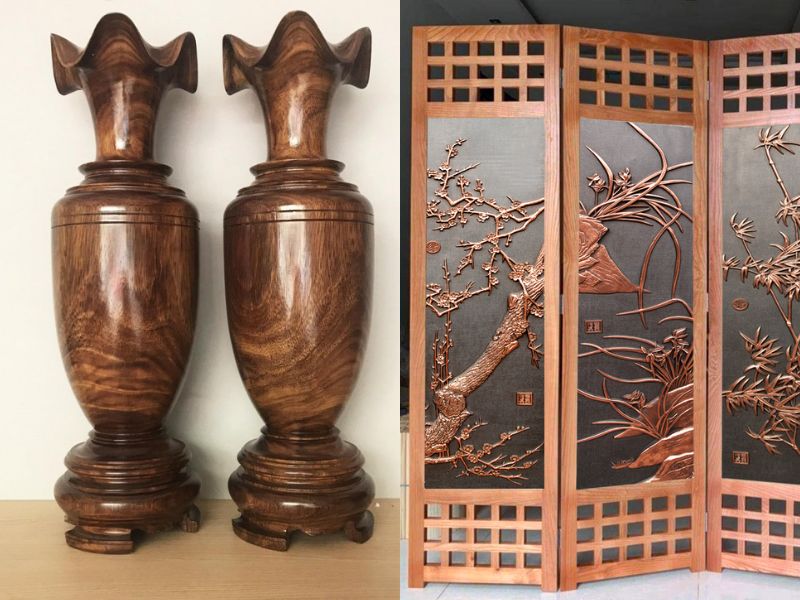 - Đồ trang trí: Để tạo điểm nhấn cho không gian, bạn cũng có thể dùng gỗ chạm khắc hoa văn, làm án gian, bình phong, lục bình…