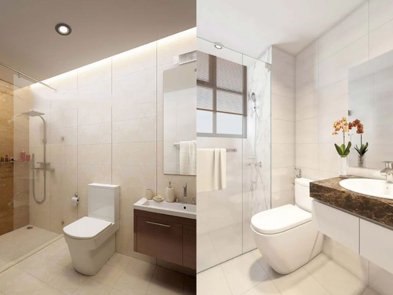 - Chọn thiết bị vệ sinh kích thước nhỏ gọn như lavabo treo tường, bồn cầu dạng treo, tủ âm tường để tiết kiệm diện tích