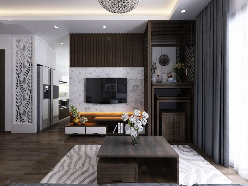 Các căn hộ chung cư có diện tích hạn chế có thể bố trí khu vực thờ cúng trong phòng khách với vách ngăn nhẹ để đảm bảo sự riêng tư.