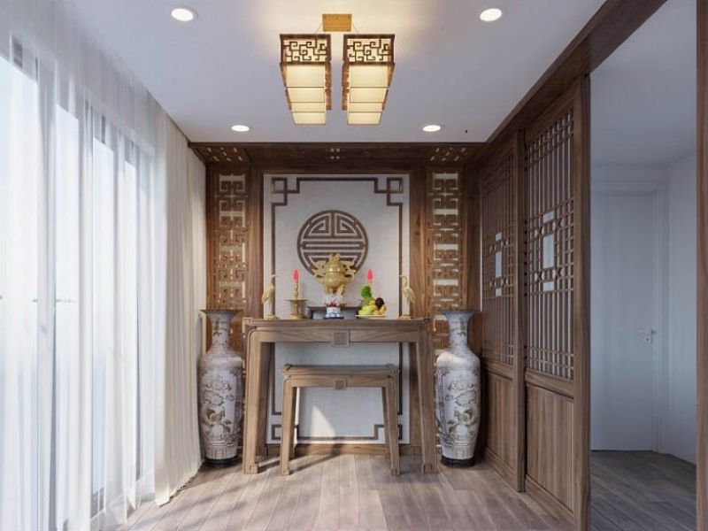 - Bố trí vách thờ gỗ, lam gỗ hoặc vách CNC họa tiết nhẹ nhàng để tăng sự yên tĩnh, riêng tư cho khu vực thờ cúng