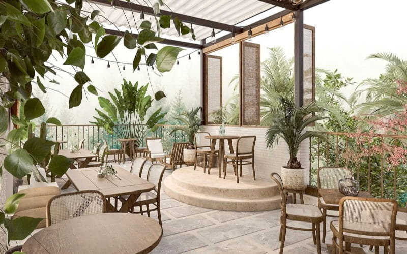 Với thiết kế này, các yếu tố tự nhiên như cây cỏ, hồ nước và không gian xanh luôn được ưu tiên. Mái vòm hoặc ô che mưa nắng có thể được sử dụng để tạo ra sự che chắn, đồng thời không làm mất đi vẻ đẹp của quán cafe.