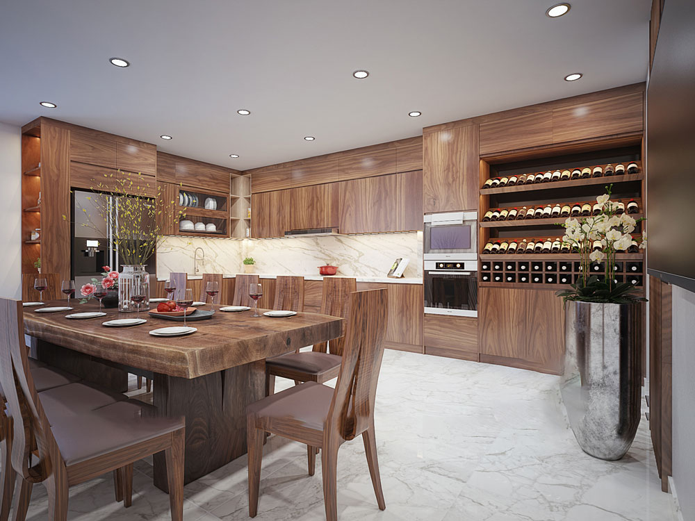 • Với bếp lớn: có thể chọn tủ rượu liền tủ bếp hoặc tủ rượu độc lập cao 2 m, rộng 80 – 100 cm để tạo điểm nhấn.