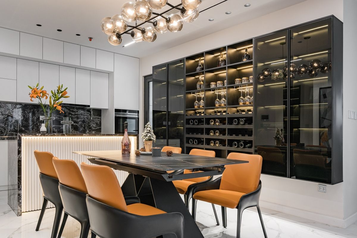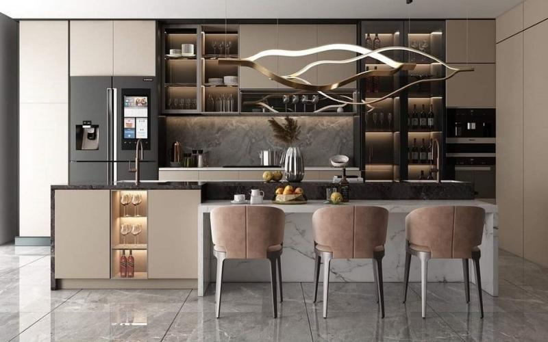 Nếu không gian bếp có quầy bar kết hợp tủ rượu, gia chủ nên chọn mẫu có đèn LED hoặc kệ trưng bày mở để tăng sự sinh động.