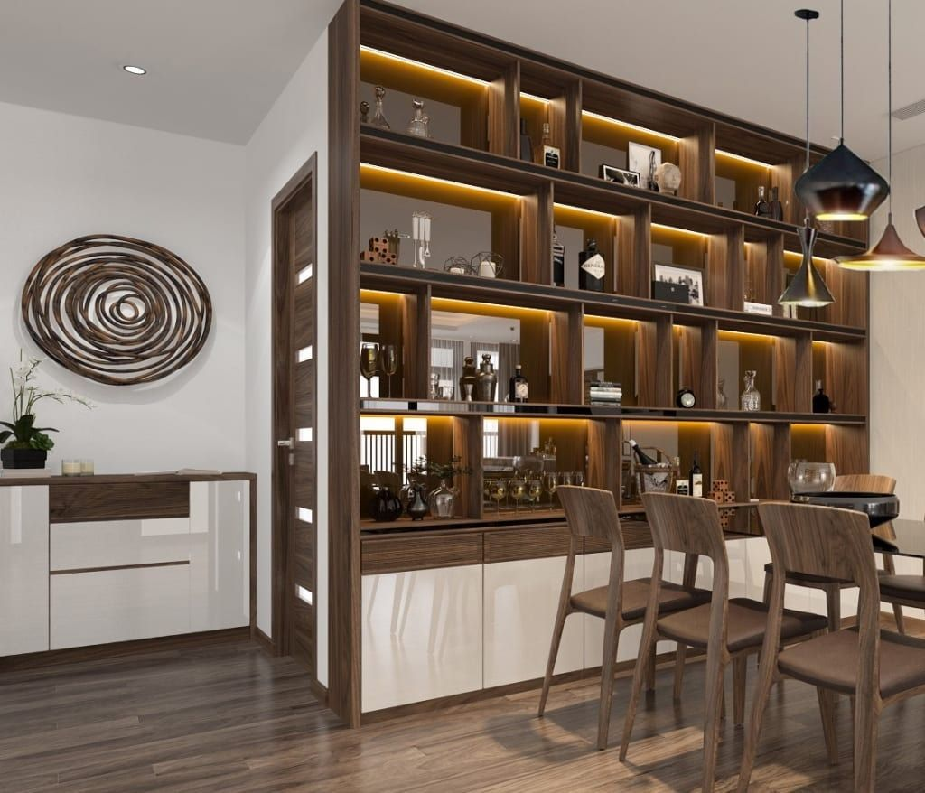 Gợi ý: Nếu gia chủ muốn tạo điểm nhấn, hãy chọn tủ rượu đứng ngăn phòng khách và bếp để tăng tính sang trọng.