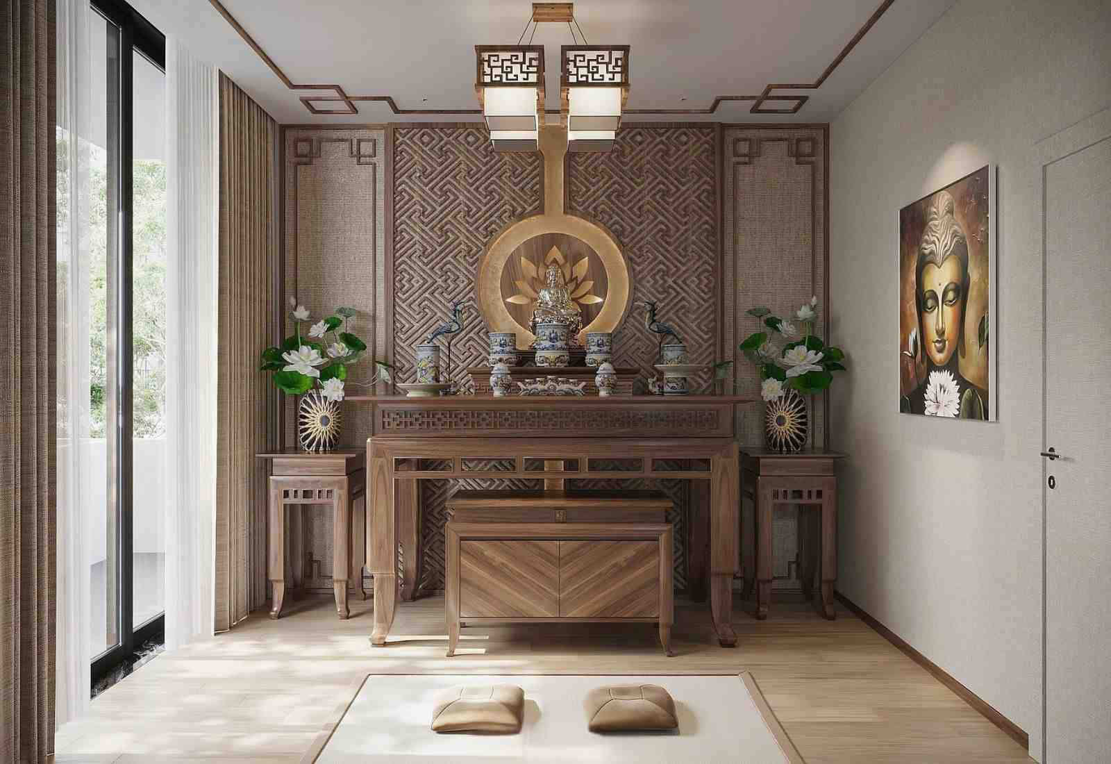 Vách ốp tường phòng thờ không chỉ giúp không gian thờ cúng trang nghiêm hơn mà còn bảo vệ tường và tăng giá trị thẩm mỹ cho ngôi nhà.